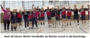 Der Werler TV kehrt in die Handball-Bezirksliga zurück – nach 28 Jahren. Der Aufstieg steht schon länger fest, dank des 31:25-Auswärtssiegs im Spitzenspiel bei der SG Kamen II am Samstagnachmittag macht es das Team von Lars Kröllken und Dominik Junger aber auch als Meister. Das Duell mit dem punktgleichen Tabellenzweiten war lange Zeit ausgeglichen, zur Pause stand es noch 14:14.